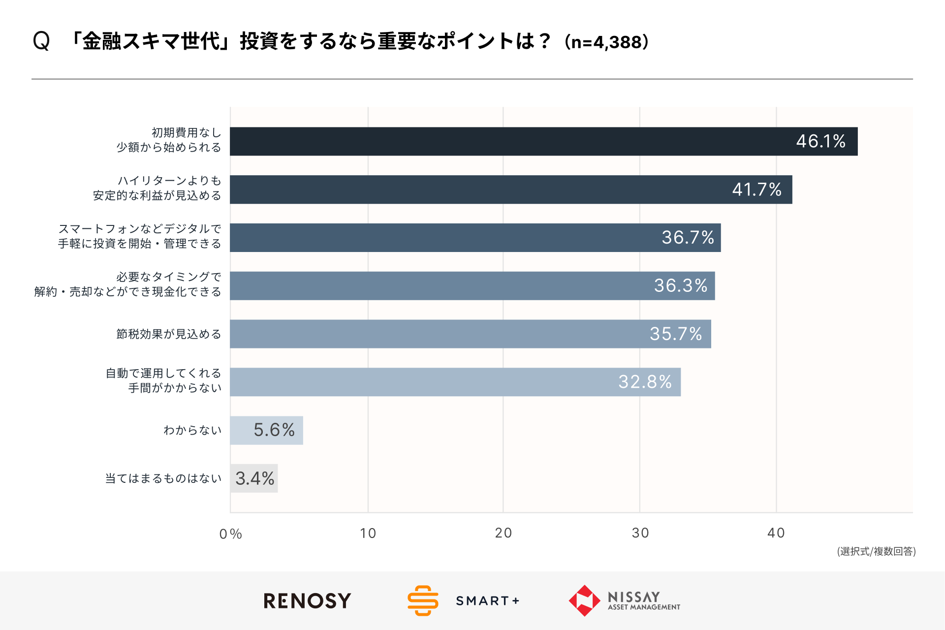 「投資経験者」と「やったことはないが、関心はある」層に、投資をする上で重要視するポイントをお聞きしました。「初期費用なし/少額から始められる」が46.1%と約半数が回答し、続いて「ハイリターンよりも安定的な利益が見込める」が41.7%、「スマートフォンなどデジタルで、手軽に投資を開始・管理できる」が36.7%という結果になりました。金融スキマ世代は、投資をする上で「始めやすさ」「安定的な利益」「デジタルで管理できる手軽さ」を求めていることが分かりました。