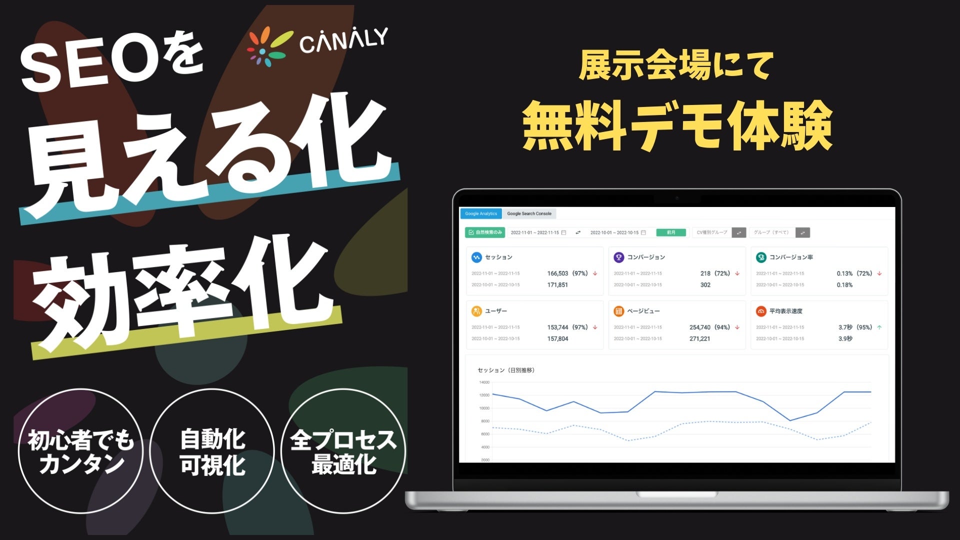 ご来場いただいた方は、CANALYの無料デモ体験が可能です。GA4やGoogleサーチコンソールのデータを活用した自社サイトの分析をはじめ、競合サイトのトラフィックやキーワードを分析して自社と比較ができる機能など、多彩な分析機能を体験いただけます。ご来場者限定のキャンペーンもご用意しておりますので、ぜひお気軽にお立ち寄りください。