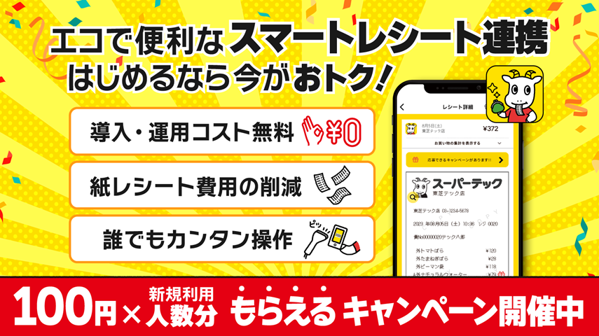 「スマートレシート®」は、スマレジをご利用されているIOS端末でアプリ連携を行えば利用が可能となり、導入及び運用に関するコストも0円です。さらに、新規のお客様が「スマートレシート®」を利用すれば、利用者一名につき100円が加盟店へ進呈される「スマートレシート連携キャンペーン」を開始いたします。この機会に是非スマレジと「スマートレシート®」の連携をご検討くださいませ。