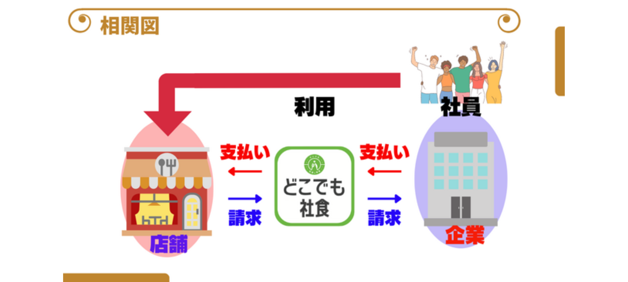 どこでも社⾷は、⾃社に社員⾷堂の設備を持たない企業でも、近くの飲⾷店と提携する事により「社⾷」環境を実現できるサービスです。