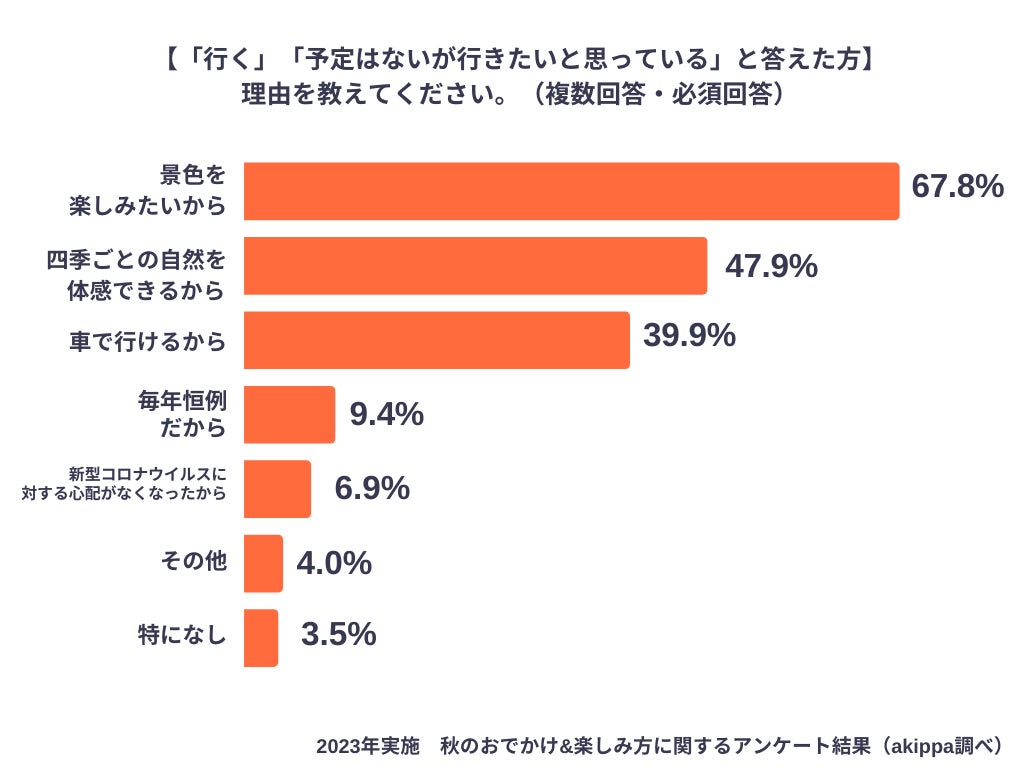 紅葉に「行く」、もしくは「予定はないが、行きたいと思っている」と答えた方に理由を聞いてみると「景色を楽しみたいから(67.8%)」が最多という結果になりました。次いで「四季ごとの自然を体感できるから(47.9%)」となっており、景色や自然を楽しみたいという理由が多く挙げられました。