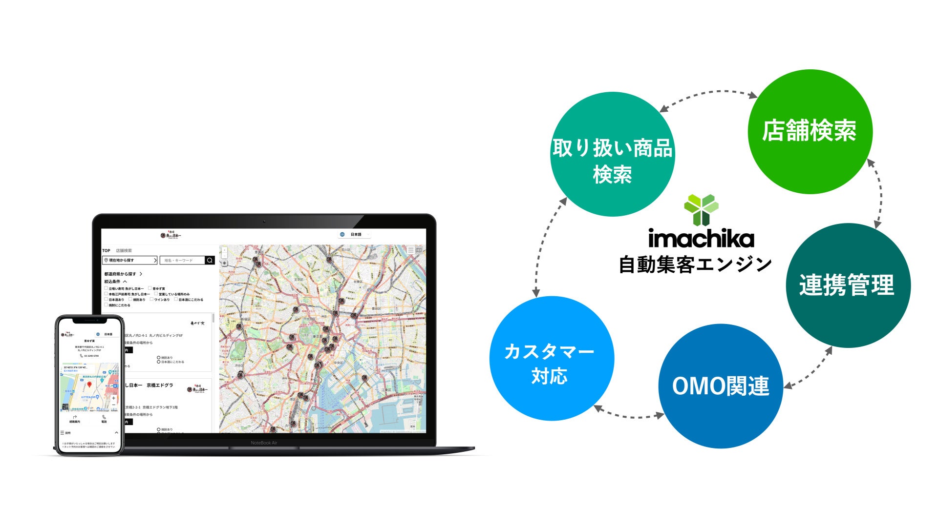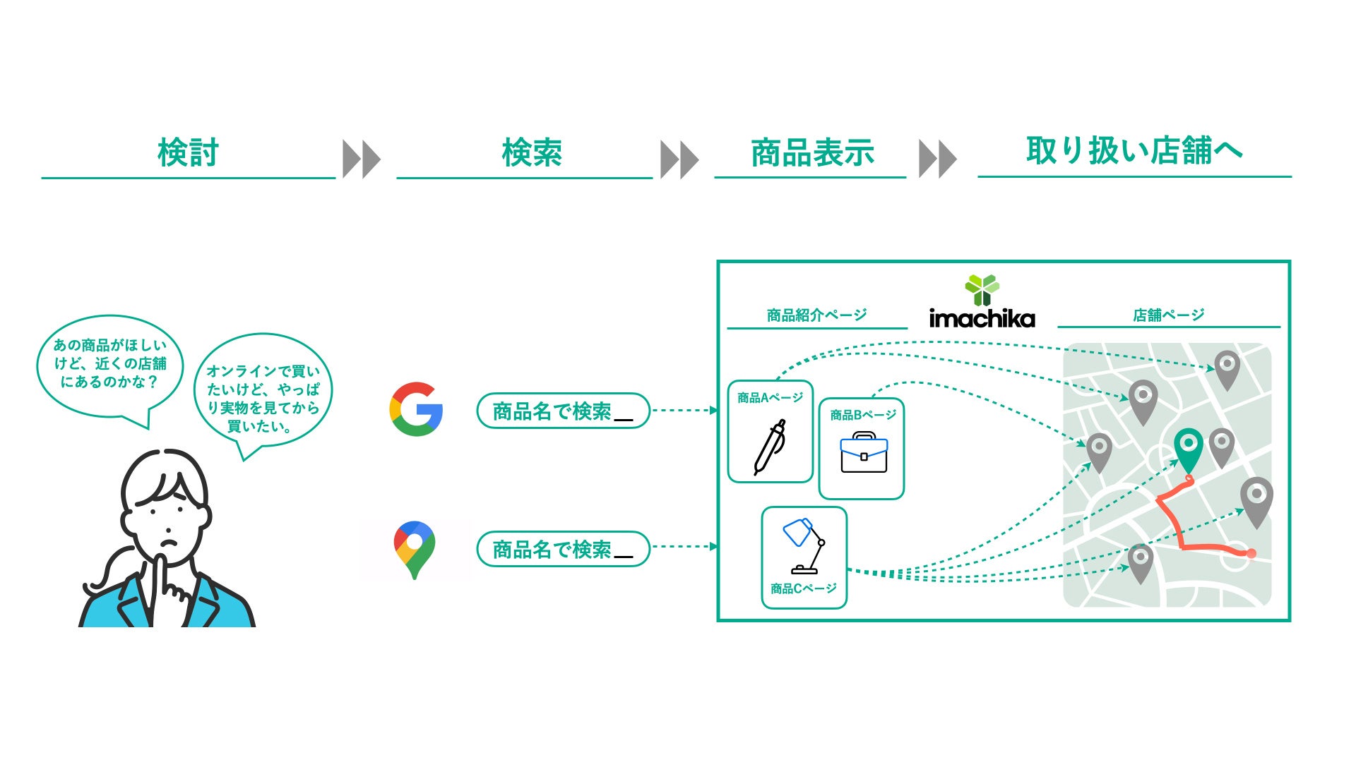 顧客は商品やサービスを探す時、検索ブラウザやマップアプリで検索をします。imachikaの取り扱い商品検索サービスを導入すれば、自社サイトの商品ページが表示されやすくなり、商品ページと近くの取り扱い店舗情報を表示できるので、集客に効果的です。ECサイトともつなげることもでき、オンライン購入にも効果的です。