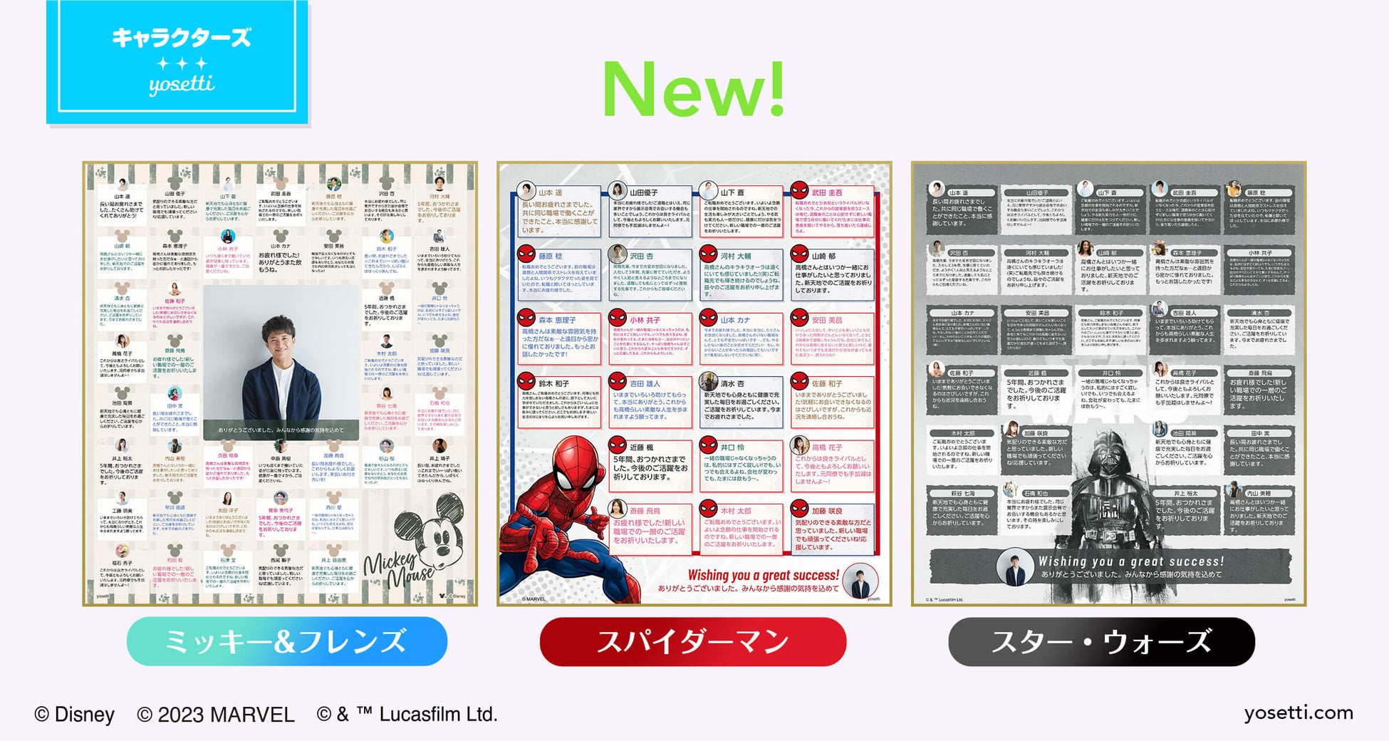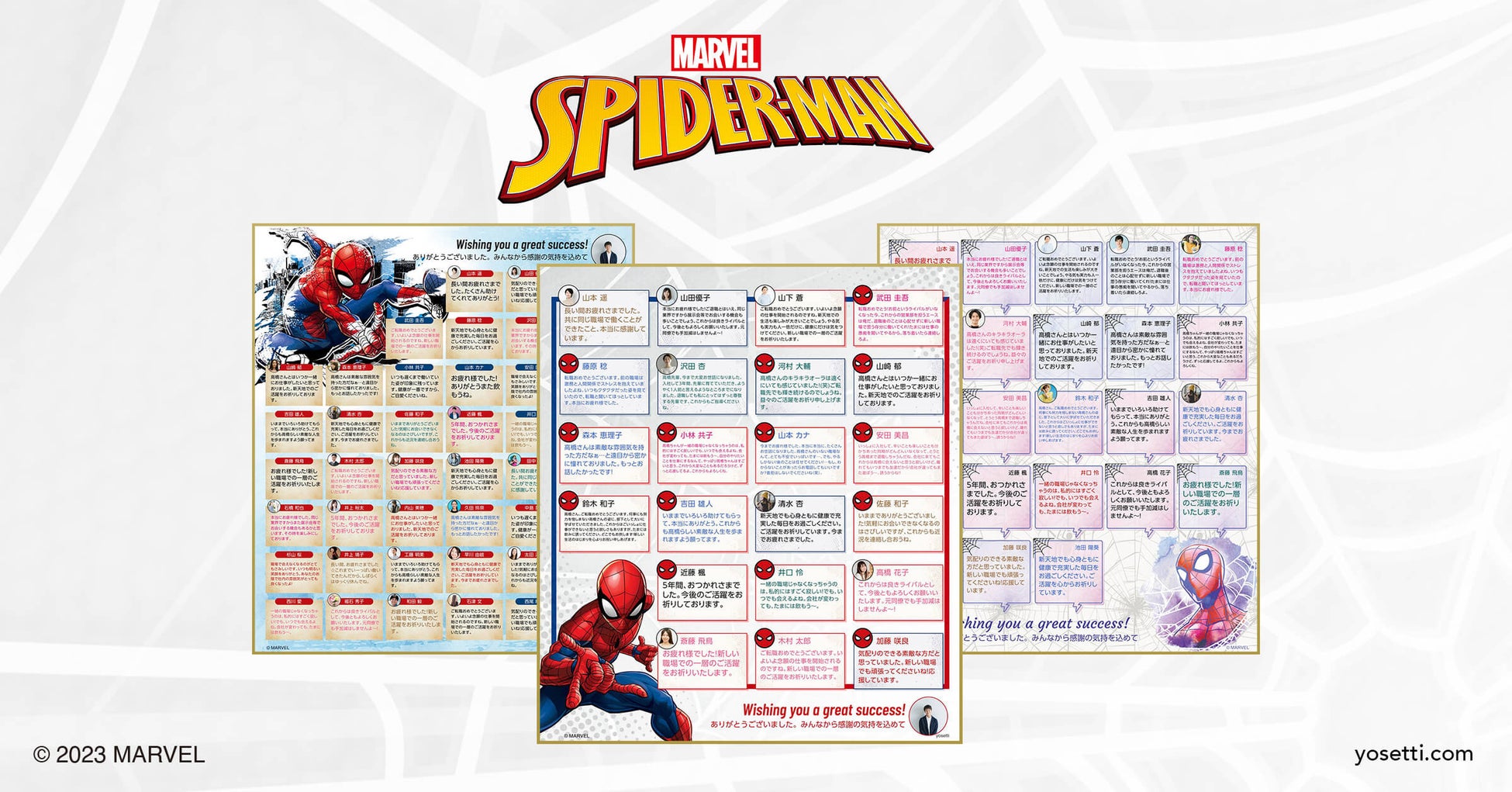 また、今回の目玉となるのがアメリカンコミックを代表するヒーロー「スパイダーマン」。待望の声をいただき、3種類が新たにヨセッティに登場しました。スパイダーマンの世界観を表現したポップなものから、水彩画タッチの柔らかいデザインまでご用意しました。送別やお祝いなど感謝の気持ちを伝えるシーンで是非ご活用ください。