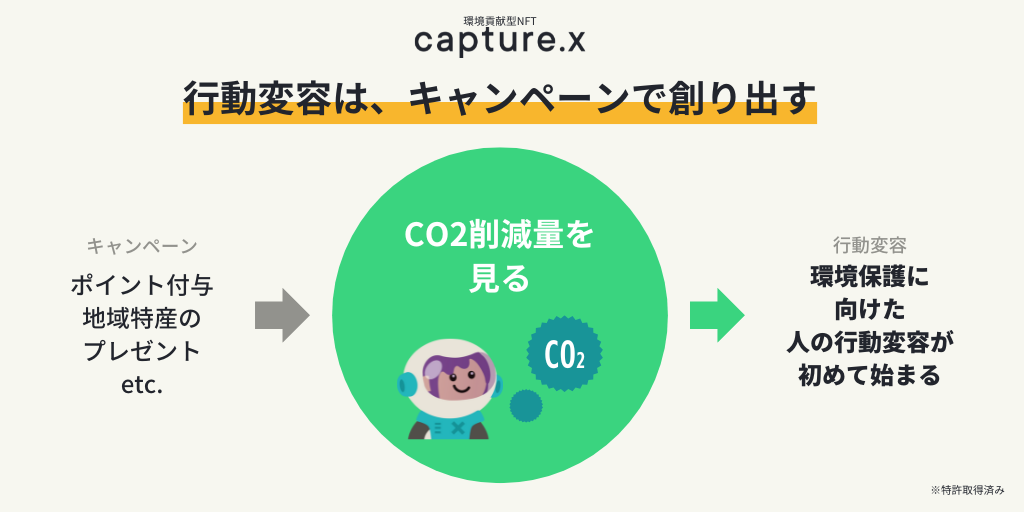 また、行動変容が継続的に行われるよう、毎日アプリを立ち上げる様々なインセンティブを用意しています。アプリを立ち上げてCO2削減量を確認することで得られるポイント(エールポイント)や、ふるさと納税とのコラボレーション、キャラクターとのコラボレーションを展開しています。capture.xのビジネスモデルおよび実現技術は特許を取得済みとなります。