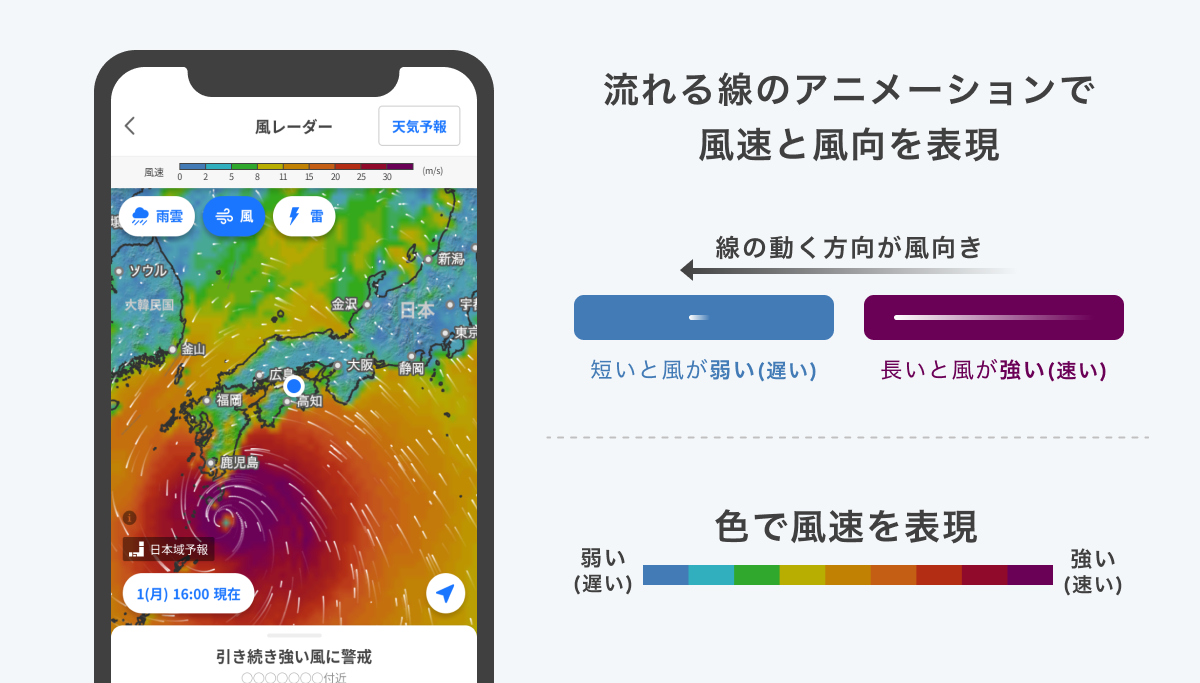 本機能は、地図上に流れる線のアニメーションにより、一目で分かりやすく風速と風向を表現し、色の分布図で風速を表示します(画像1)。また、選択地点の風速と風向の推移をグラフで、強い風が想定される場合には「非常に強い風」「猛烈な風」など風の強さをテキストで表示し、いつ風が強まるのか、どの方角にどの程度の風が吹くのかなど一目で確認できます(画像2)。