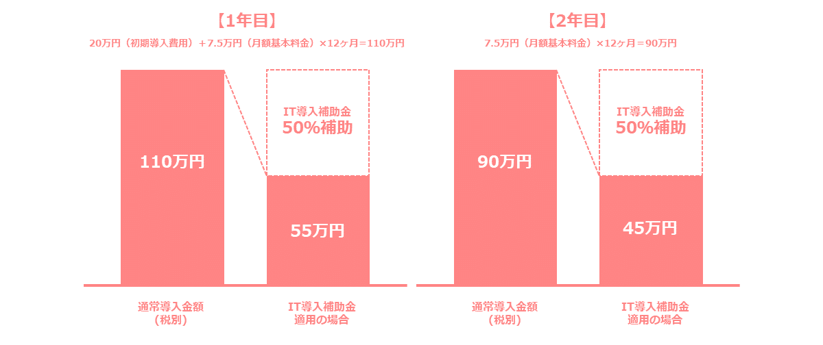 20万円(初期導入費用)+7.5万円(月額基本料金)×12ヶ月=110万円→55万円
