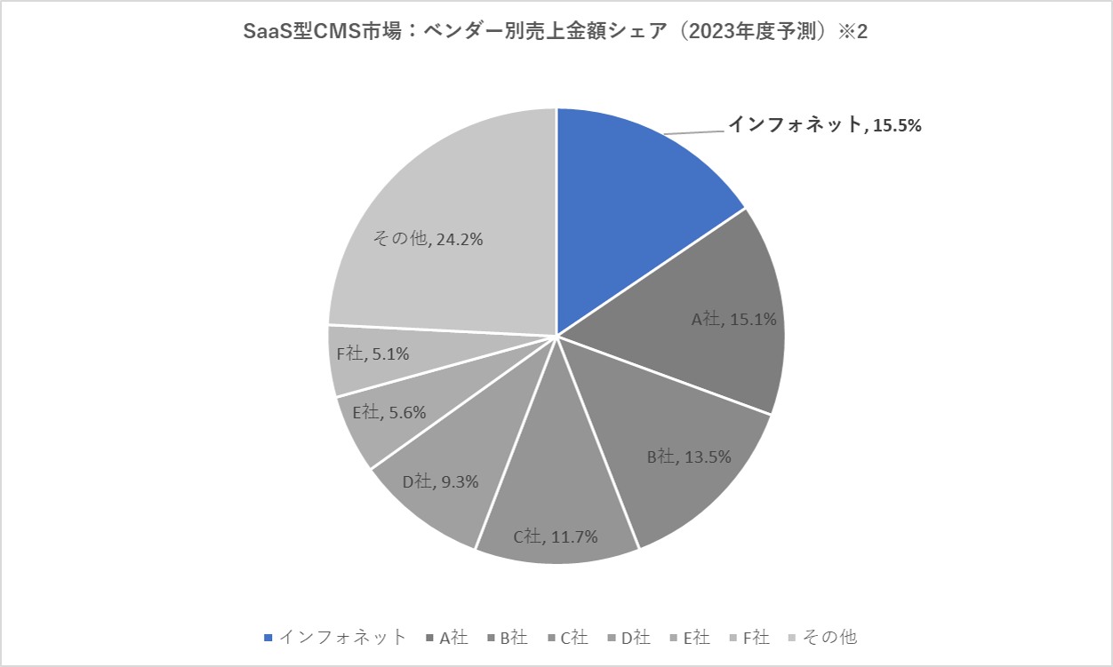 オールインワン商用コンテンツ管理システム「infoCMS」を提供する株式会社インフォネット(本社:東京都千代田区、代表取締役社長執行役員 日下部拓也、証券コード:4444、以下「当社」)は、株式会社アイ・ティ・アール(以下、ITR)が発行した市場調査レポート『ITR Market View:ECサイト構築/CMS/SMS送信サービス/電子請求書サービス/電子契約サービス市場2023』の「SaaS型CMS市場のベンダー別売上金額推移およびシェア」において8年連続No.1※1を獲得しました。