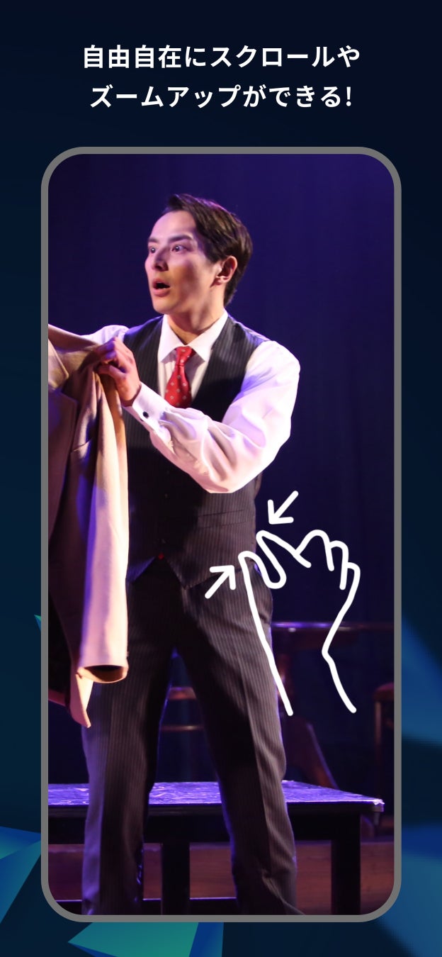 画面のスクロールで観たい画角にフォーカスし、さらにズームアップ/ズームアウトして自分好みに観劇ができます。演劇配信アプリとしては業界初の機能です。