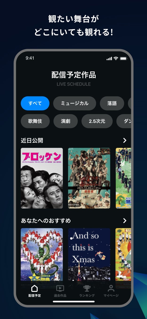 普段は劇場に行かなければ観られない演劇作品を、スマホアプリで観ることができます。ライブ配信はもちろん、過去に上演した作品のアーカイブも配信中。
