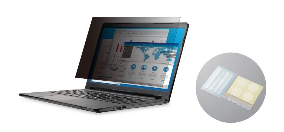 移動中やオフィスなどでの業務中に周囲から画面をのぞき見されるリスクを軽減する「のぞき見防止フィルター」です。画面正面を中心に60度(左右30度)より外の角度からはまっ黒に見えるので、画面を見られる心配がありません。