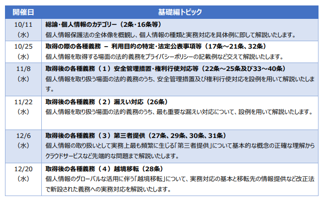 本セミナーでは、「個人情報保護法の重要テーマ」と題し、好評をいただいた前回までの講演内容を全面的にアップデートし、個人情報保護法の定める内容(基礎編)を6回に分けて解説します。また、本セミナー開催後は、応用編として、人工知能や医療分野における実務上の問題、さらには他の法領域との交錯、国際的な問題といった事項を解説するセミナーの開催も予定しています。