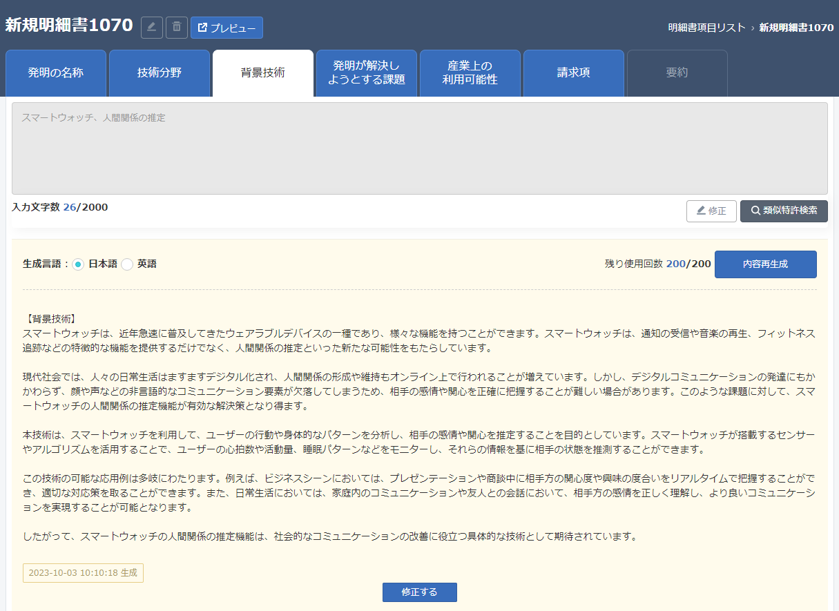 動画では、「スマートウォッチ」というキーワードから特許文案を生成した。