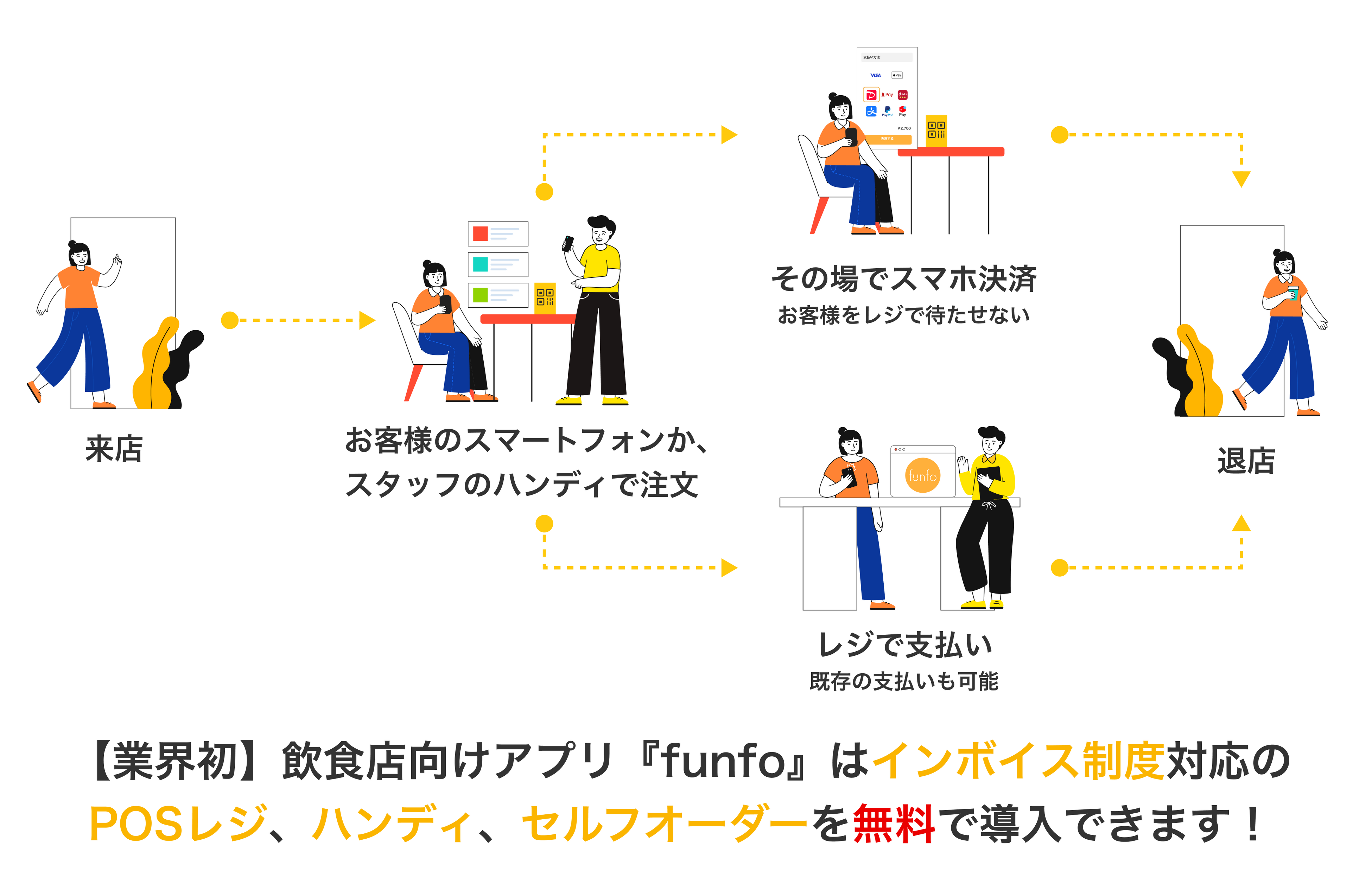 2023年は急激な円安に伴う電気代や原材料費の高騰や、インボイス制度(適格請求書等保存方式)の新設や、コロナ禍明けなど飲食店にとって大きな変化があったのではないでしょうか。こうした時代背景を考慮し飲食店の皆様へ店舗経営の一助になるために、業界初となる「POSレジ」、「ハンディ」、「セルフオーダー」を無料プランでも提供することにいたしました。さらに、『funfo』はIT導入補助金対象ツールに選ばれたので機材購入費用をおさえてご導入いただけます。(※2)