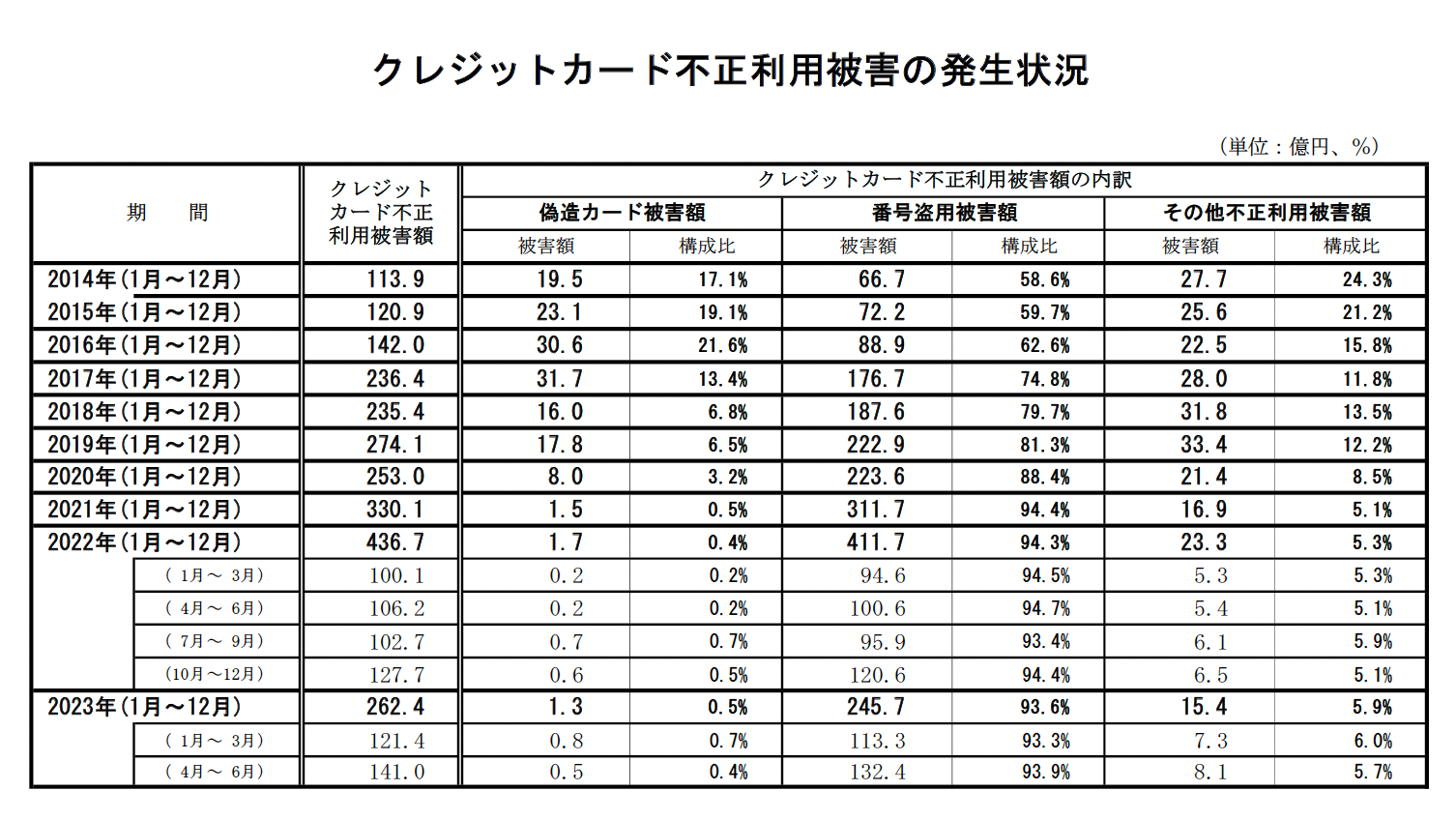 出典:一般社団法人日本クレジット協会「クレジットカード不正利用被害額調査」(2023年9月)