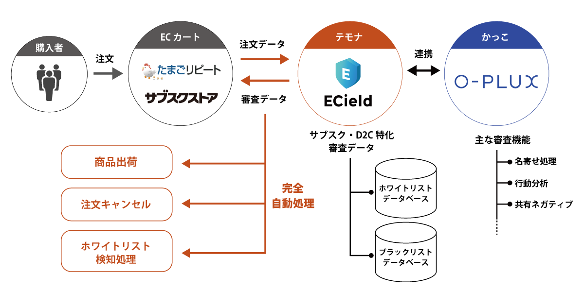 ショッピングカート、受注チャットボットとの自動連携により、面倒な不正注文の処理(チェック、出荷止め)を完全自動化。テモナの提供する「たまごリピート」「サブスクストア」にも対応。