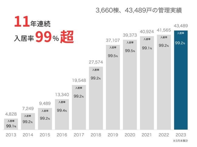 エリアニーズ対して適切な賃料設定をするからこそできる実績として、11年連続繁忙期である3月末の入居率は99%超えを維持しております。