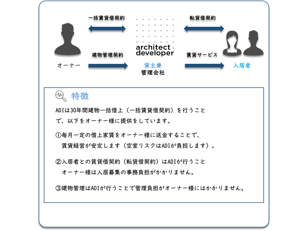 また、一括借上管理システムによる安定した賃貸経営の実現のため、ADIが物件を一括借上することにより、ADIは不動産オーナーに代わって貸主となり、 入居募集やメンテナンスを行っています。