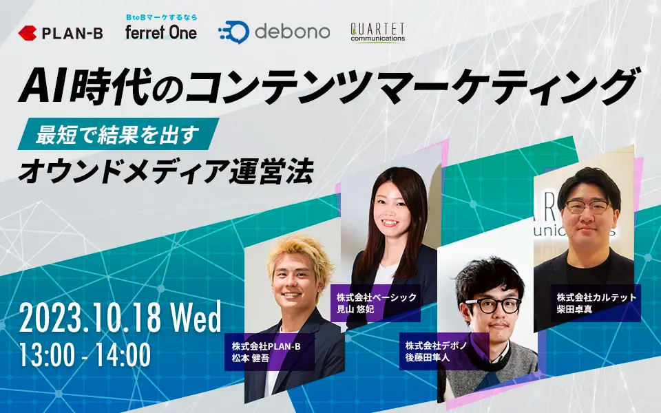そこで今回、コンテンツマーケティングの先端を走る当社、株式会社デボノ、株式会社カルテットコミュニケーションズ、株式会社PLAN-Bの4社が登壇し、「AI時代だからこそ求められるコンテンツマーケ/オウンドメディア手法」について解説いたします。当日は、集客からCVまでを見据える中で、どのように考え、どのようなアクションを起こすべきなのかなどをお話いたします。
