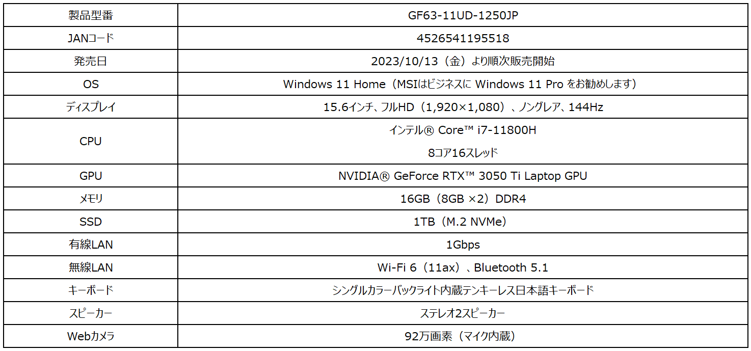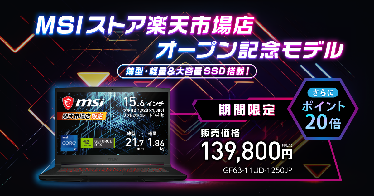 MSIストア楽天市場店のオープンを記念し、手に取りやすい価格と持ち運びやすい薄型・軽量ボディが特徴のゲーミングノートPC『GF63 Thin』シリーズにて、幅広いジャンルのゲームをプレイ可能で大容量1TB SSDを搭載した特別構成モデル「GF63-11UD-1250JP」をMSIストア楽天市場店限定で2023年10月13日(金)より発売いたします。