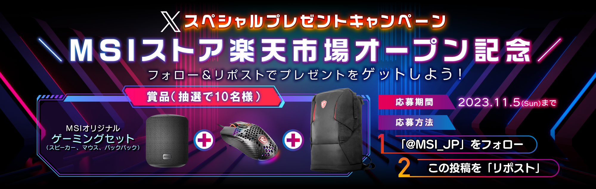 『MSIストア楽天市場店』のオープンを記念して、期間中、MSI日本公式X(旧Twitter)アカウントのフォローおよびキャンペーン投稿をリポストしたお客様の中から抽選で10名様に豪華賞品をプレゼントいたします。