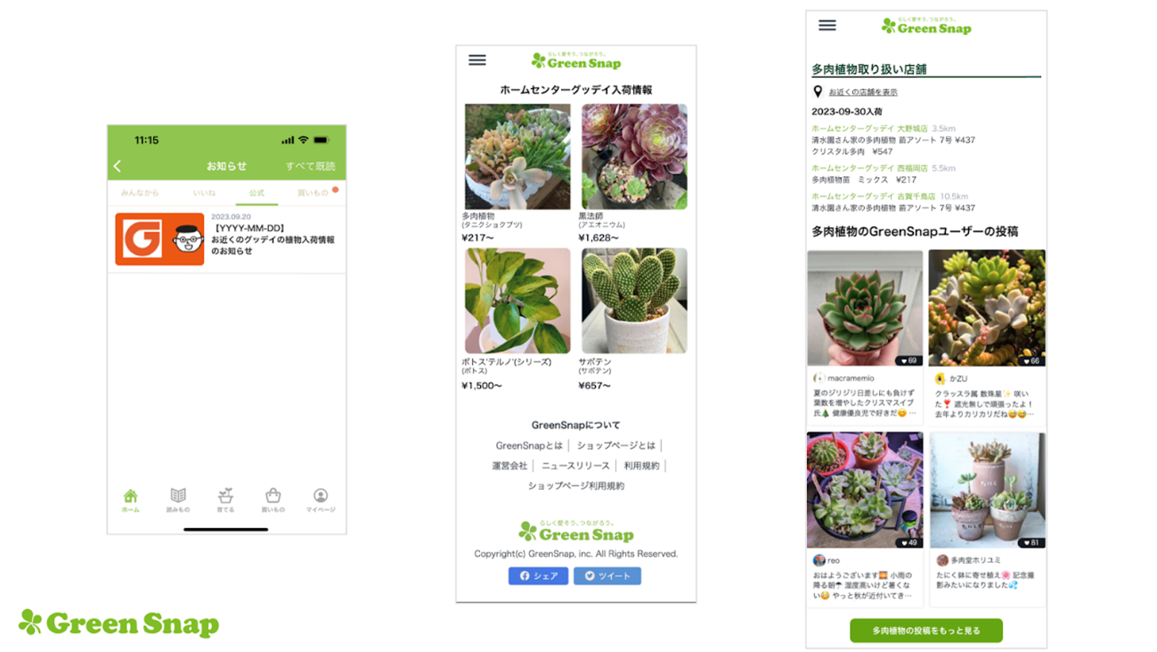 第一弾として、北部九州・山口を中心にホームセンター グッデイ(以下、グッデイ)を64店舗展開する株式会社グッデイにおいて本サービスの導入が決定しています。グッデイはこれまでも積極的にデータドリブンを推進され、GreenSnapとの取り組みにおいてもUGC施策など様々なデータ活用を進めてこられました。本サービスの導入によって、グッデイの入荷情報がGreenSnapアプリを通してユーザーに通知されることとなり、お客様の利便性があがることはもちろん、店舗への来店促進になることも期待されています。