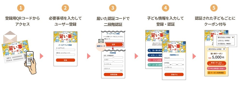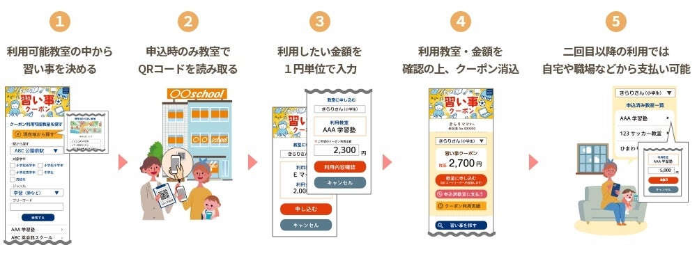 クーポンが使える習い事教室を、「最寄り駅」「対象学年」「ジャンル」「フリーワード」「位置情報」から検索します。初回訪問時に教室別QRコードを読み取って申し込んだ後は、自宅や職場などからスマホ上で支払いを行えます。対象の子どもを切り替えて、複数の子どものクーポン利用状況を一元管理できます。