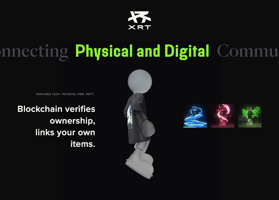 “フィジタル” とは、Physical(フィジカル)とDigital(デジタル)をかけ合わせた造語です。「XRT」とは、さまざまなIPやコンテンツの世界観を拡張するファッションにおける新規格。フィジカルなアイテムと、デジタルなアイテムを紐づけることで、それぞれの利用を可能にする「フィジタルアイテム」の所有を通じて、自己と他者・個々とコミュニティをつなぐ新たな手段を提供します。
