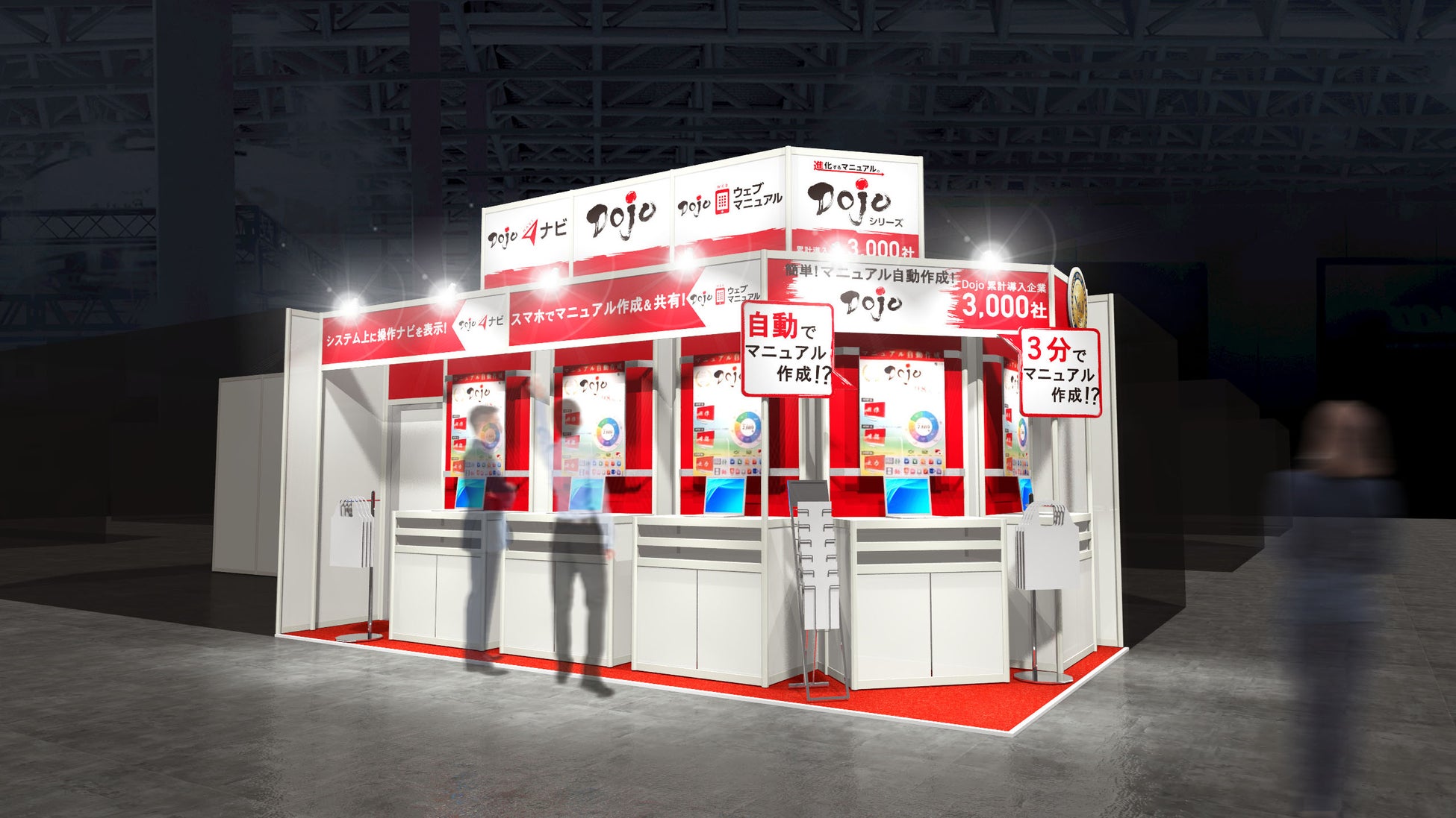 テンダのブースでは、マニュアル作成ツール「Dojo」、ノーコード操作ナビゲーションシステム「Dojoナビ」、マルチデバイスマニュアル作成・共有システム「Dojoウェブマニュアル」を実際に操作・体験いただけます。また、マニュアル作成に時間や人員をかけられない、マニュアルの修正・更新が追いつかないといった課題をお持ちのお客様に向けて、マルチコンテンツ・マルチデバイス・多言語対応も可能なマニュアル作成代行サービスもご案内いたします。