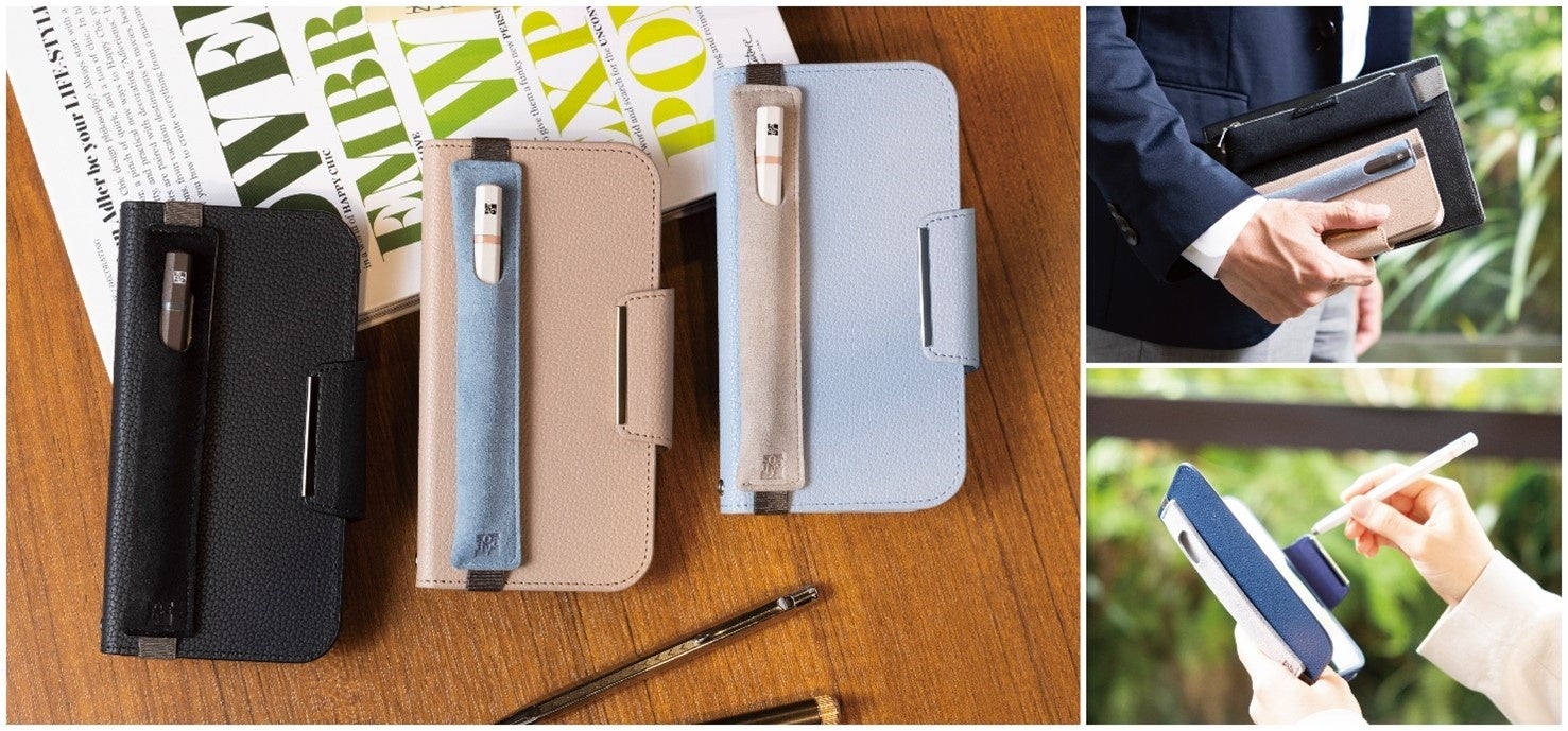 「バンド付きペンケース」は「タッチペン」を収納できるデザインとなっており、手帳型のスマホケース(※)に取り付けて使用できるため安心して持ち運びいただけます。ケースの素材は手触りがなめらかなUltraSuede®を使用し、優しい質感とペンの出し入れがしやすいデザインが特長です。逆さにしてもペンが落ちないよう内側にはマイクロファイバー生地を、バンド部分は伊東屋の製品でも採用されている薄く伸縮性に優れたこだわりのバンド素材を使用しています。カラーは、「ブラック」「ブルー」「グレー」の3色を発売いたします。