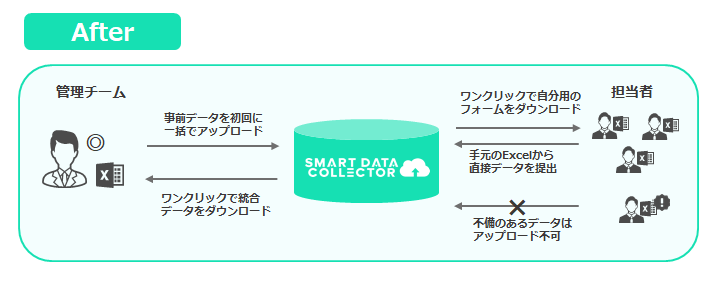 『SMART DATA COLLECTOR』はExcelに特化したクラウド型のWEBデータベースサービスです。Excelから直接クラウド上のデータベースにデータを投入し、いつでも取り出せますのでこれまでのExcelフォームはそのままでデータだけを効率的に管理することができるようになります。詳細に関しては以下リンクより資料請求をお願いします。