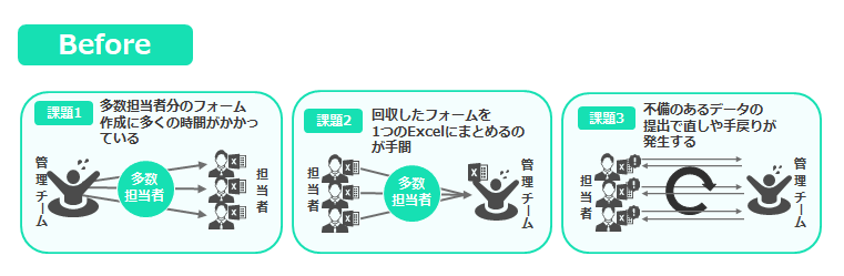 今回、医療機器メーカー様では担当者が行う情報収集の業務にスマコレをご採用頂きました。これまで、各拠点に所属する担当者それぞれに配布する情報収集の入力フォームを本部で作成・送付、担当者が Excelファイルにデータを入力しExcelファイルを本部へ共有、本部の担当者が1つのフォーマットへ統合する、という作業を毎回手作業で実施していました。