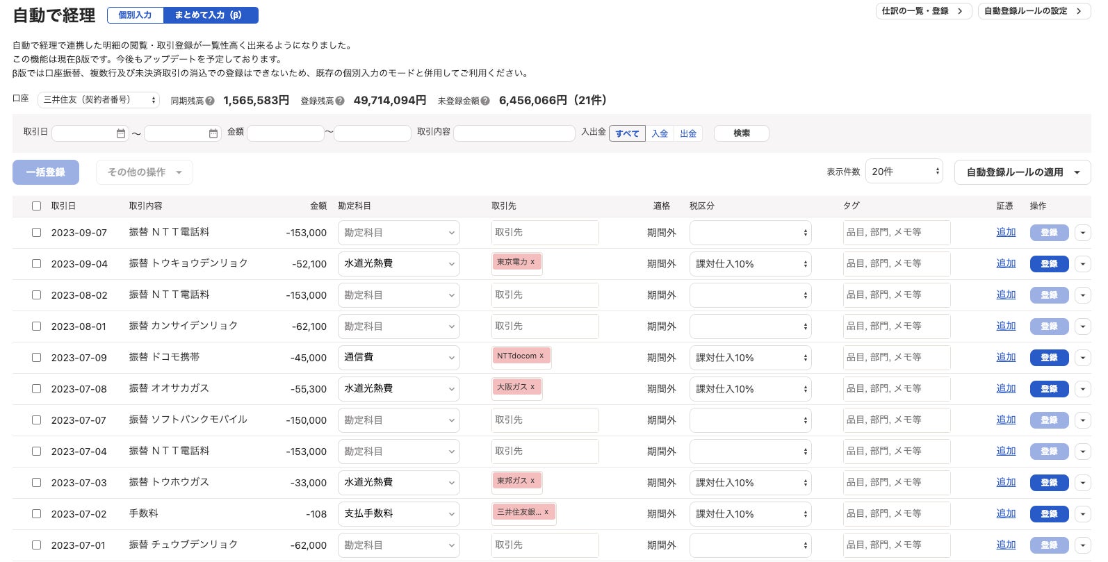 今回の「まとめて入力β版」の提供により、一覧性の高いユーザーインターフェース(UI)を提供し、口座の同期残高・登録残高・未登録金額も表示されるため作業の進捗管理も可能です。