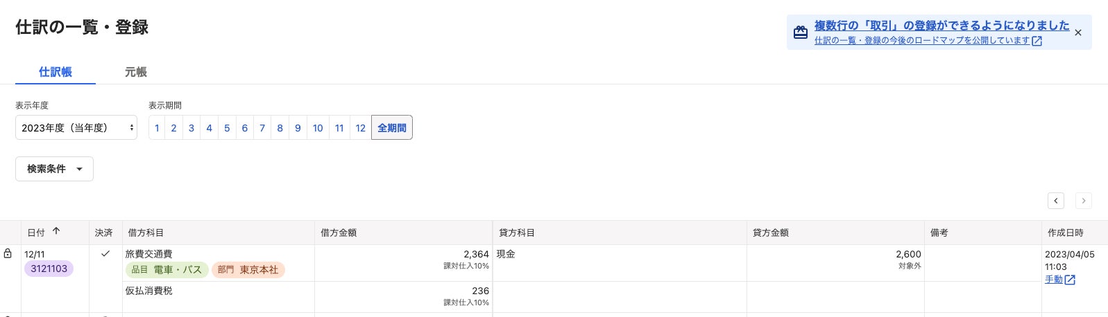仕訳の項目をクリックすると「仕訳の一覧・登録」画面の「仕訳帳」のタブを、表示期間「全期間」及び作成日時が最新の日付が選択された画面に遷移することが可能です。