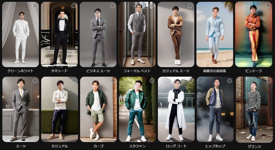 ロングドレス、ワンピース、ビジネススーツ、タキシードなど男女それぞれ14種類のスタイルを搭載。元写真とスタイルを選ぶだけでさまざまな服装に着せ替えできます。