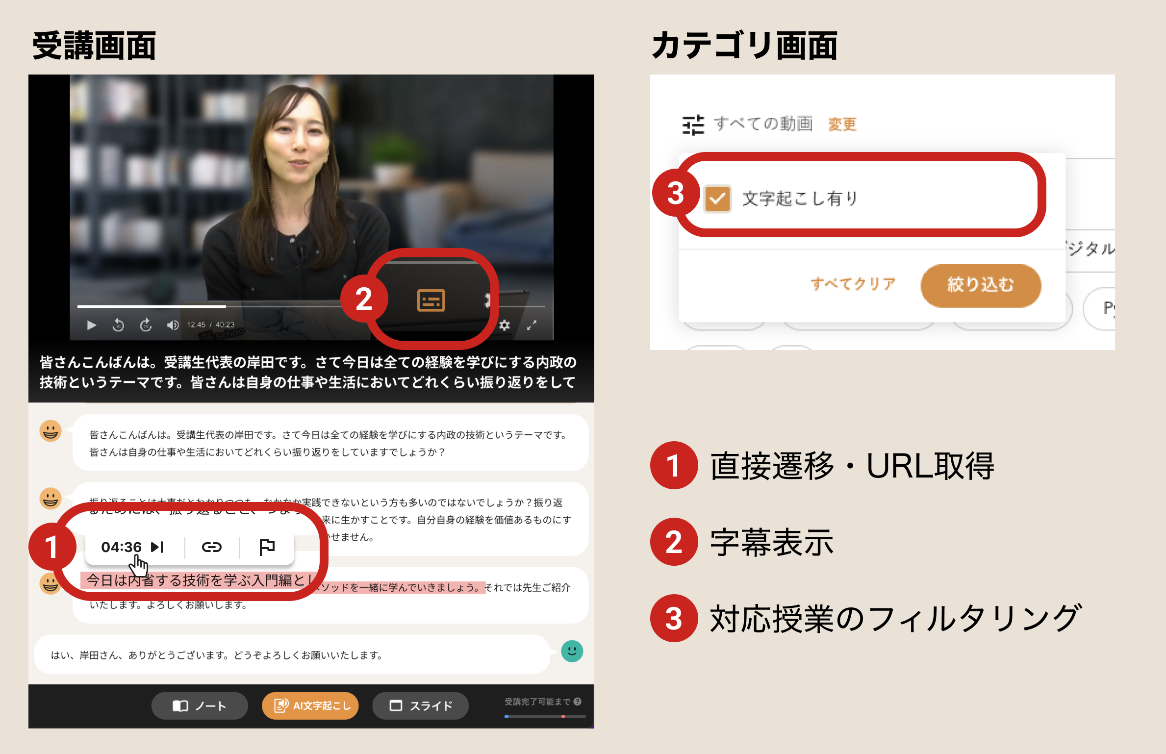スクリプトは授業動画のタイムラインと連動しており、スクリプトの文字をクリックすると、該当する動画の再生位置に移動します。また、スクリプトからその再生位置の動画URLを取得することもでき、他者との共有も可能です。(画像の❶参照)