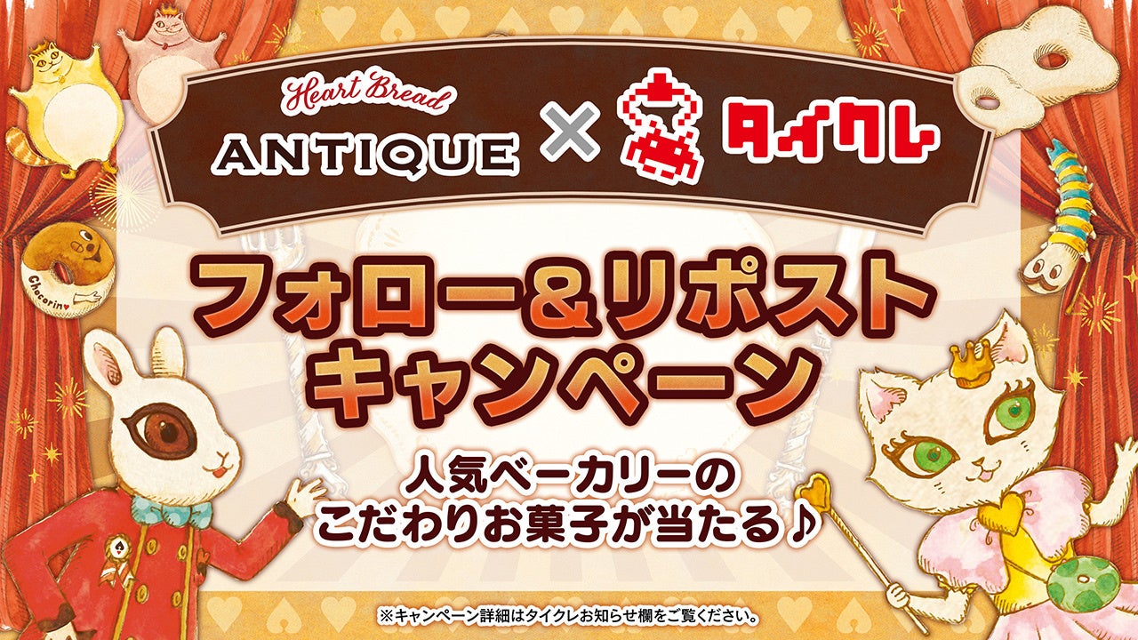 タイクレX(旧Twitter)アカウントにて、「ANTIQUEで大人気のお菓子をプレゼント!フォロー&リポスト(旧リツイート)キャンペーン」を開催いたします。詳細はキャンペーン開始後タイクレ内お知らせ欄をご確認ください。