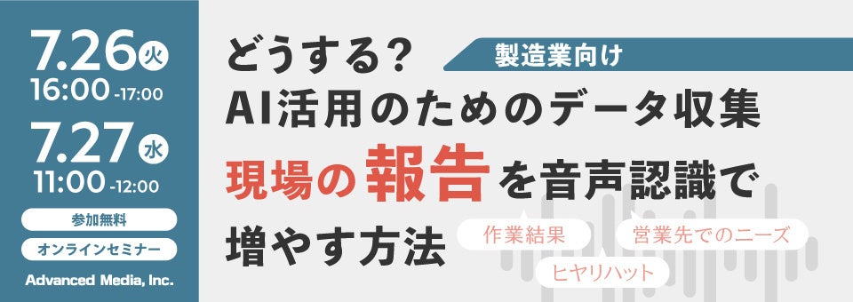 2022年7月26日(火)・27日(水)、株式会社アドバンスト・メディア(本社:東京都豊島区、代表取締役会長兼社長:鈴木清幸 以下、アドバンスト・メディア)は、オンラインセミナー「どうする?AI活用のためのデータ収集 ~音声認識で現場の報告を増やす方法とは~」を開催いたします。