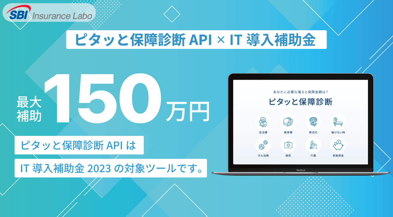 これにより「IT導入補助金2023」において補助対象となる規模の保険代理店等の事業者様が「ピタッと保障診断API」を導入する際に、初期・月額費用の最大50%、2年間で最大150万円の補助金を申請することが可能になりました。