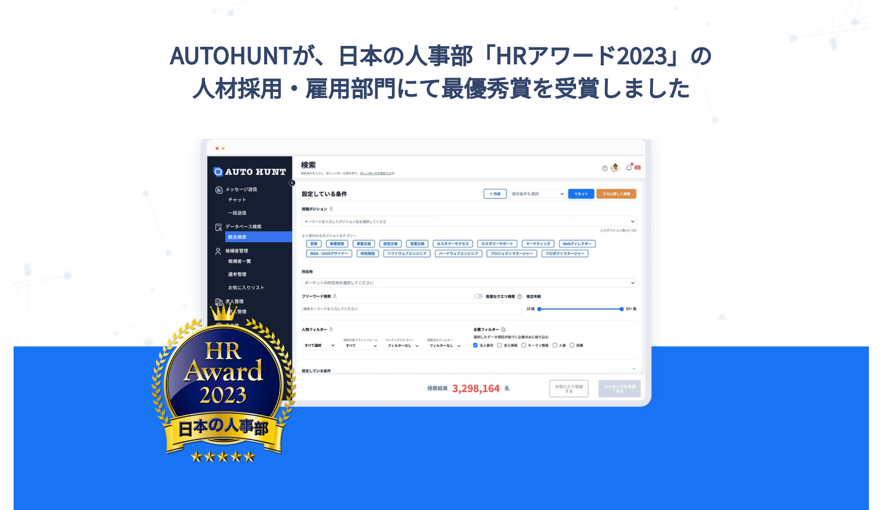 「AUTOHUNT」はWeb上に分散している人材・企業情報を収集・統合し、優秀な人材を横断して検索できる、次世代型AIタレント検索エンジンです。