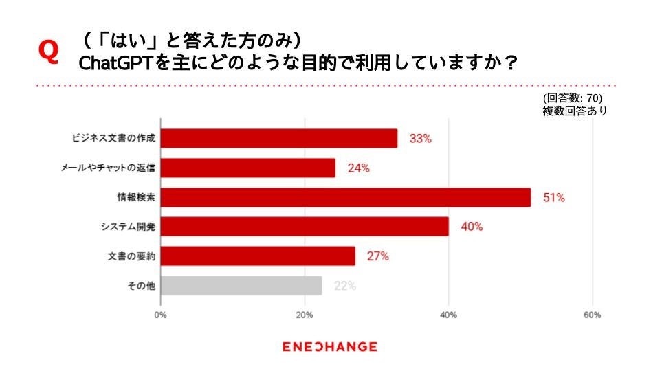 「情報検索」51%、「システム開発」40%、「ビジネス文書の作成」33%、「メールやチャットの返信」24%、「文書の要約」27%といった利用目的があげられました。