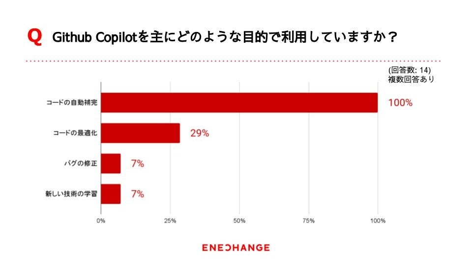 「コードの自動補完」100%、「コードの最適化」 29%、「バグの修正」7%、「新しい技術の学習」7%といった利用目的があげられました。