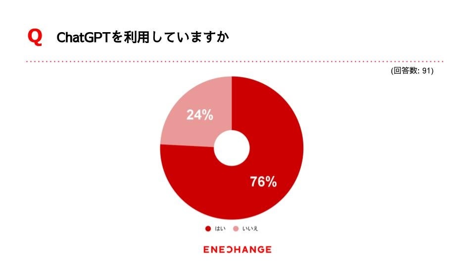 ENECHANGE(エネチェンジ)株式会社(本社:東京都中央区 代表取締役CEO:城口洋平)は、2023年4月から「GPT-4」の全従業員への導入、「GitHub Copilot」の全エンジニアへの導入による業務改革を行っています。全社導入発表から半年が経過し、全従業員の76%が業務でGPT-4を活用し、利用している業務における効率は実感として平均44%改善していることがわかりました。また、GitHub Copilotは、全エンジニアの内うち75%が業務に活用し、利用している業務における効率は実感として平均37%改善しています。全社導入以降、社内で協力して試行錯誤を繰り返しながら業務に活かし始めた活用事例もご紹介します。