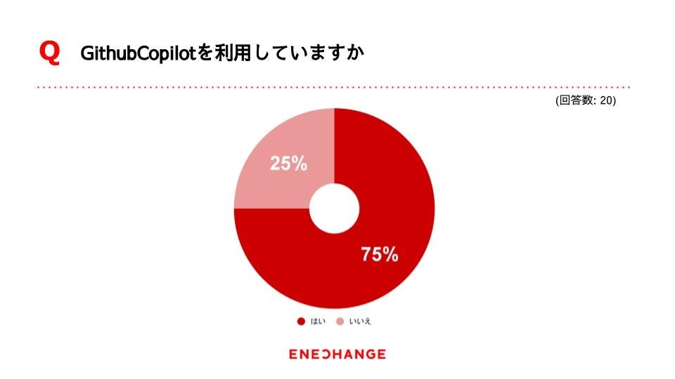 「はい」と答えた人は75%、「いいえ」と答えた人は25%でした。Github Copilotを利用していないエンジニア職の人は「開発タスクを行っていない」、「コーディングの機会がない」、「マネージャーの業務を行っている」などの回答をしています。