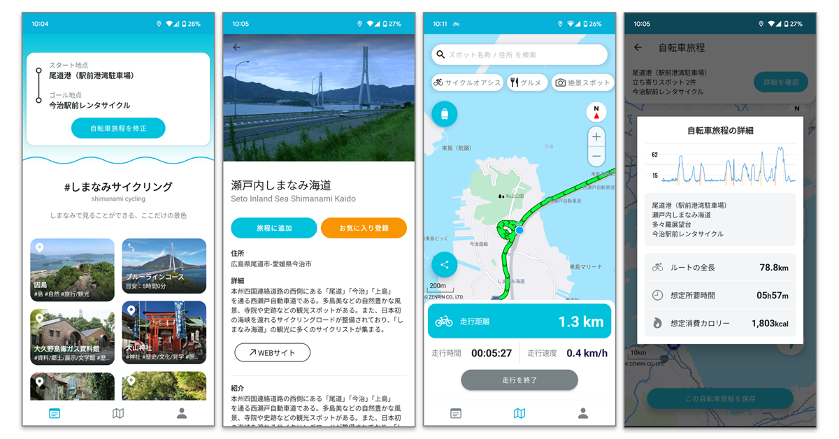 ・しまなみ海道エリアの飲食・観光等スポットの情報提供や現在地・現在の走行状況(距離や時間)等に基づいた音声レコメンド等を行い、エリア内を楽しくかつ快適に周遊できるようにサポートするアプリを提供