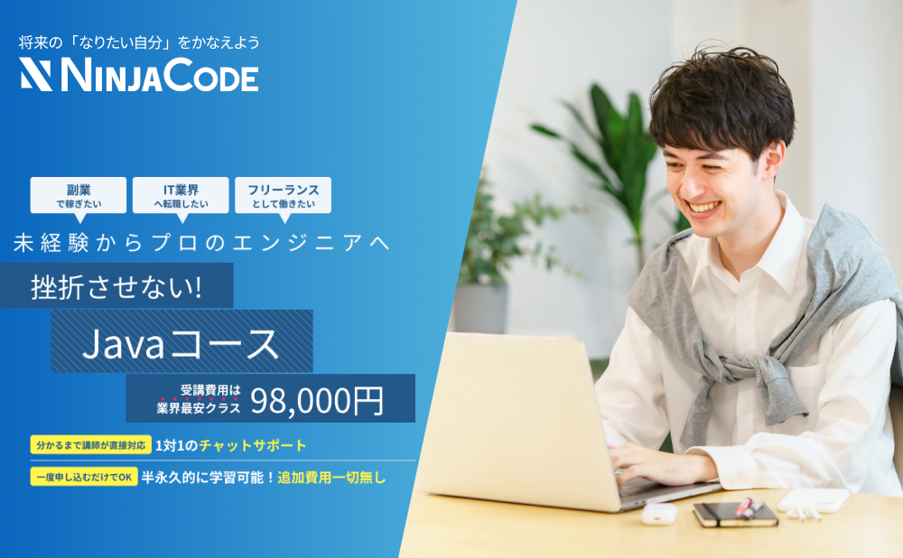 24時間質問可能のチャットサポートが付くJavaコースは、Javaを使った開発の基礎知識から大規模なアプリ開発まで通用する技術を幅広く学び、未経験からプロの開発者を目指すコースです。