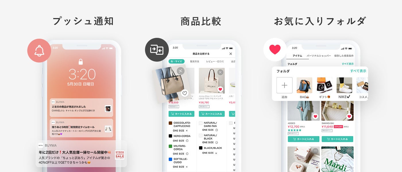 ブランドのSALEや新作情報、お得なクーポンをいち早くお知らせします。また、取引の連絡や商品の発送通知もリアルタイムで確認できます。