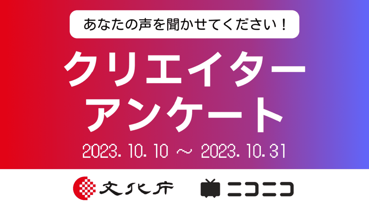 株式会社ドワンゴ(東京都中央区、代表取締役社長:夏野剛/以下ドワンゴ)およびフリーランスのクリエイターをサポートする団体である一般社団法人 日本ネットクリエイター協会(東京都中央区、代表理事:横澤大輔/以下JNCA)は、文化庁が実施する「個人クリエイター等の権利情報を登録する仕組みの分野横断化に関する調査研究」の一環として、フリーランスクリエイターを対象にした「ニコニコ動画」を用いてのアンケートを2023年10月10日(火)17時より実施することをお知らせします。