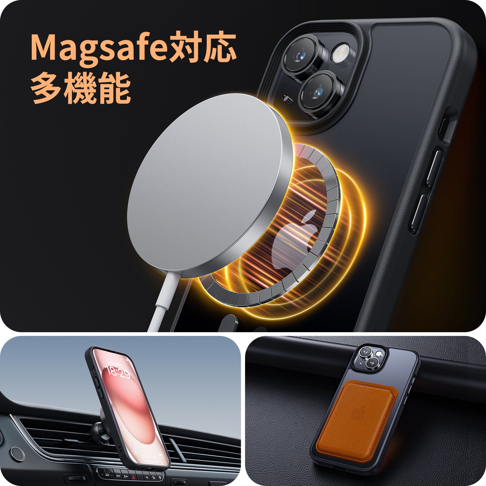 iPhone15ケース内部に38個の強力なN52マグネットを搭載しており、一瞬でピッタリとくっつき、高速充電を実現!いくら振っても落ちないので、充電しながらゲームをやっても問題はありません!!また、ワイヤレス充電やモバイルバッテリー・車載ホルダー・スタンド・リングなど全てのMagSafeアクセサリーにもばっちり対応しています。