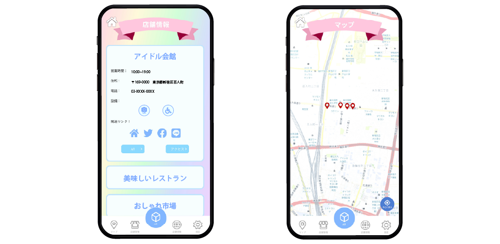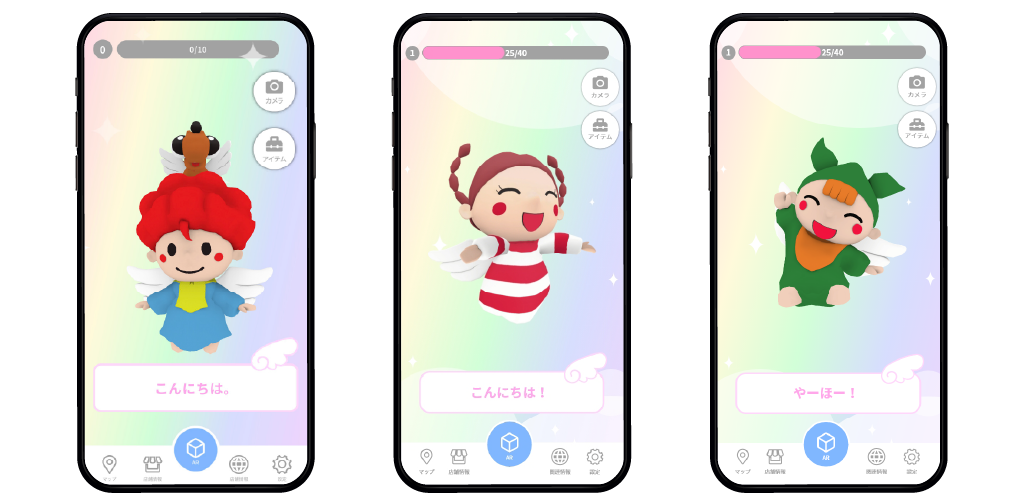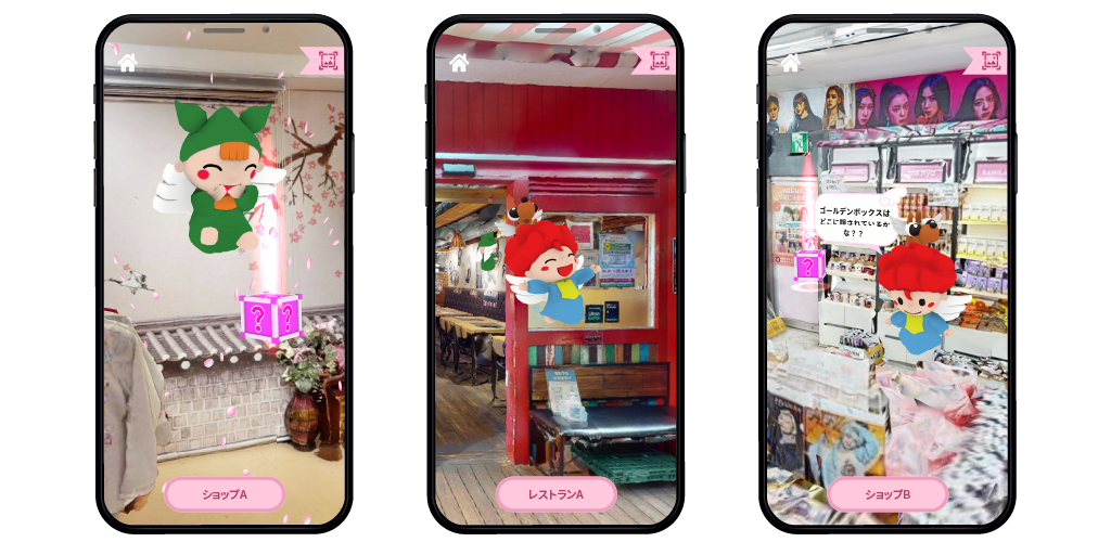 AR機能を使って、商店街を楽しく探索することができます。