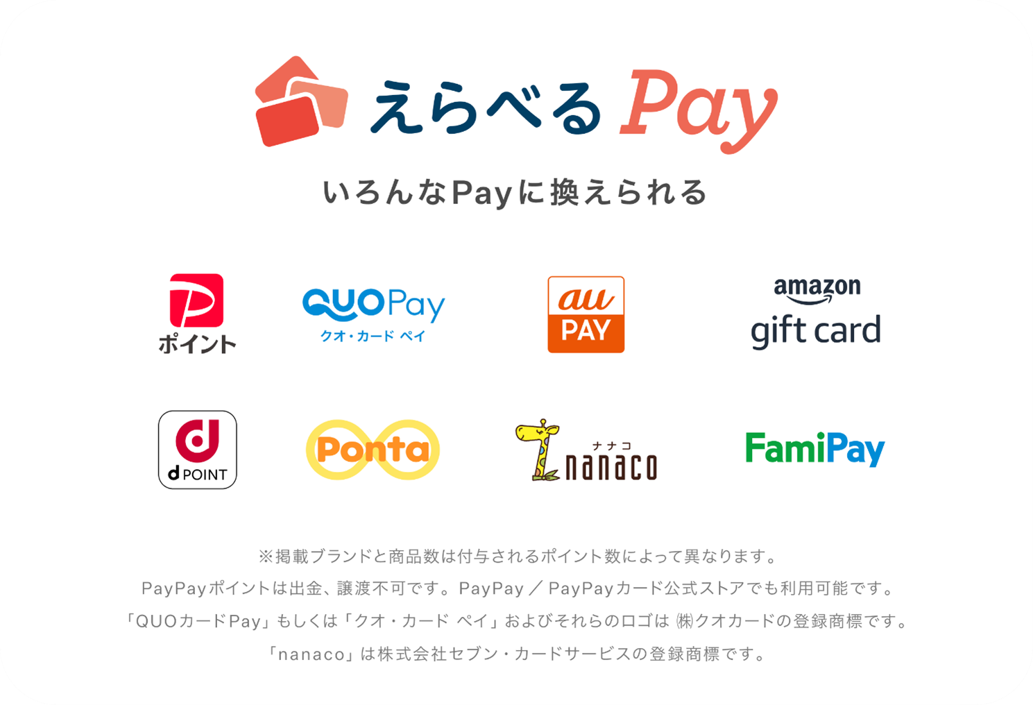 「えらべるPAY」のロゴは登録商標です。PayPayポイントは出金、譲渡不可です。PayPay/PayPayカード公式ストアでも利用可能です。